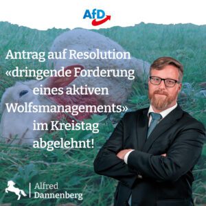Zur gestrigen Kreistagssitzung hat die AfD-Fraktion ihren Resolutionsantrag zur Forderung der Bejagung des Wolfes mit zwei Tagen Vorlauf als Dringlichkeitsantrag eingebracht (siehe Anhang). Dies ist laut Geschäftsordnung des Kreistages legitim. In der dann erfolgten Abstimmung über die Dringlichkeit des Antrages stimmten die Abgeordneten der AfD sowie ein weiterer Abgeordneter für die Dringlichkeit des Antrages, alle anderen Abgeordneten dagegen.